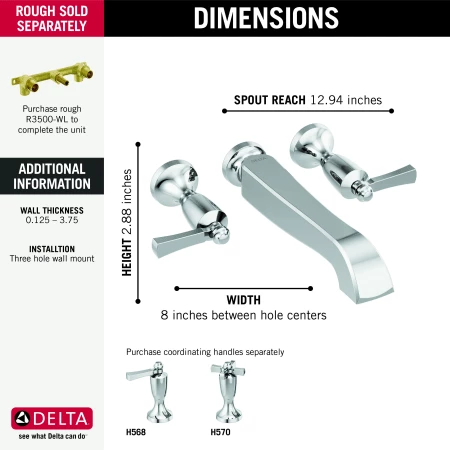 - Spout Reach: 12-3/4″ (from wall to center of spout outlet)