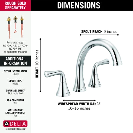- Widespread deck mounted installation – 3 hole faucet with 8″ – 16″ centers