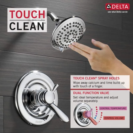- Touch Clean: Only Delta offers showers equipped with Touch Clean soft spray holes that allow you to easily wipe away calcium and lime build-up with the touch of a finger. This is particularly helpful for areas with hard water.